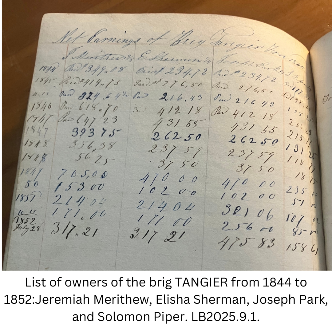 The first account book includes accounts with the brig TANGIER as well as other vessels in which Joseph Park owned shares from 1842 to 1879. The 92' TANGIER was built in Searsport by masterbuilder Jeremiah Merithew (1792-1862) in 1842. It was jointly owned by Jeremiah Merithew (3/8 share), Elisha Sherman (1/4 share), Joseph Park (1/4 share), and Solomon Piper (1/8 share).